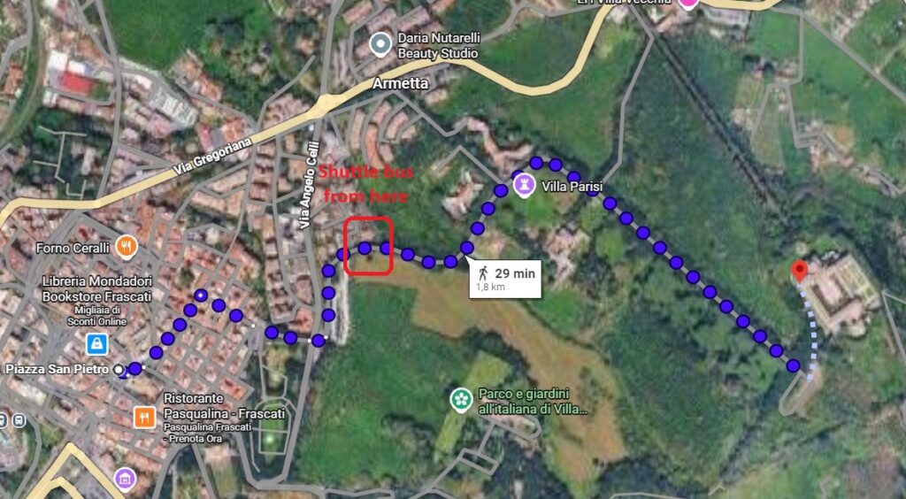 By foot: We suggest to find accomodation in the city of Frascati. From the city center of Frascati the conference venue can be reached with a pleasant 20 to 30 minute walk (less than 2km), partly in the enjoyable gardens of the historic villa. A bus service from the gate of the park to the main building will be provided. Staying in the city center of Frascati allows also to reach the center of Rome in 30 minutes by direct train.
